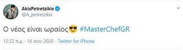 «Ο νέος είναι ωραίος» έγραψε χαρακτηριστικά ο Άκης Πετρετζίκης στον προσωπικό του λογαριασμό στο Twitter, αμέσως μετά τη νίκη του.