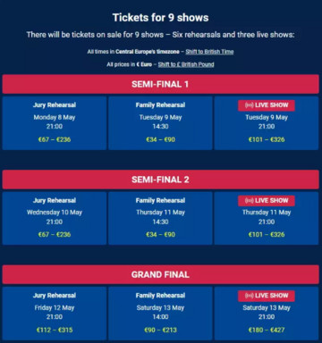 Συγκεκριμένα, τα πρώτα εισιτήρια θα δοθούν στην αγορά την Τρίτη 7 Μαρτίου στις 14:00 ώρα Ελλάδος και θα είναι διαθέσιμα μόνο μέσω του Ticketmaster UK (και όχι μέσω της εφαρμογής της εταιρίας). Μάλιστα, υπάρχει ειδική πρόβλεψη ώστε οι ενδιαφερόμενοι να μπορούν να κλείσουν εισιτήριο μόνο για μία από τις βραδιές της διοργάνωσης, ενώ οι Eurofans θα πρέπει να έχουν προσωπικό λογαριασμό στο Ticketmaster UK.