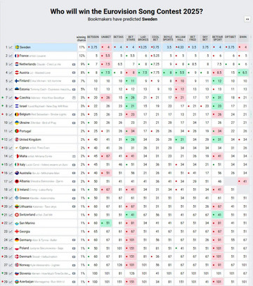 Στην κορυφή της κατάταξης παραμένει η Σουηδία, η οποία υπερασπίζεται τον τίτλο της με μεγάλες πιθανότητες να κερδίσει για τρίτη φορά. Η Loreen, η οποία κέρδισε το 2012 και το 2023, φέρνει ακόμα περισσότερη δυναμική στην Σουηδία.