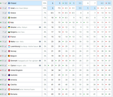 Το Ισραήλ έπεσε στη 2η θέση, ενώ η Φινλανδία αναρριχήθηκε στην πρώτη θέση.
