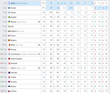 Στην κορυφή της πεντάδας παραμένει το Ισραήλ, ενώ ακολουθούν η Φινλανδία και η Ελλάδα, η οποία αυτή τη στιγμή βρίσκεται στην 3η θέση.
