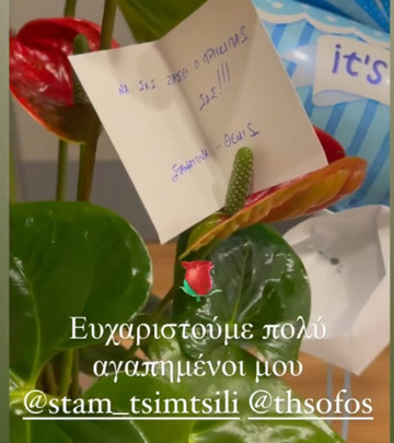 Λίγο λοιπόν πριν πάρει εξιτήριο και επιστρέψει στο σπίτι της, η ίδια δεν έχει σταματήσει να λαμβάνει δώρα, με το δωμάτιο της στο μαιευτήριο να έχει γεμίσει! Η Σταματίνα Τσιμτσιλή και ο Θέμης Σοφός έστειλαν φυσικά και εκείνη τις ευχές τους, μαζί με ένα όμορφο μπουκέτο με φυτά αλλά και ένα μπλε μπαλόνι με την επιγραφή, “It’s a boy”!