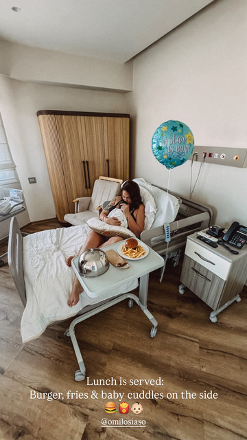 Στην πρόσφατη ανάρτηση που έκανε η Ευρυδίκη Βαλαβάνη στο προφίλ της στο Instagram, πόζαρε αγκαλιά με τον γιο της στο δωμάτιο του μαιευτηρίου. Μάλιστα, απόλαυσε και το πρώτο πλούσιο μεσημεριανό της, το οποίο ήταν μπέργκερ με πατάτες.