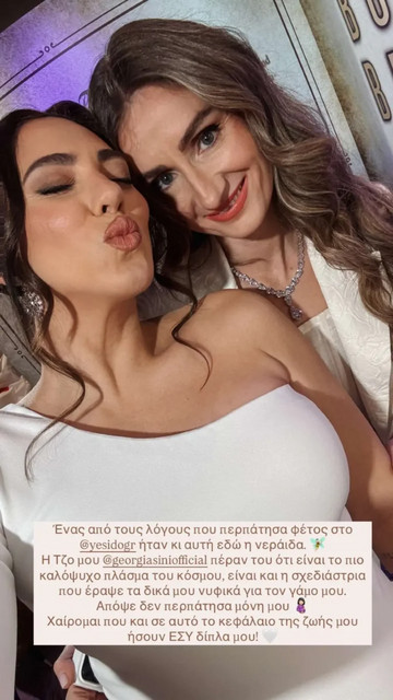 Στο Instagram, η Ευρυδίκη μοιράστηκε το μήνυμα της. Συγκεκριμένα έγραψε: «Ένας απ’ τους λόγους που περπάτησα φέτος στο Yes I Do ήταν κι αυτή εδώ η νεράιδα. Η Τζο μου, πέραν του ότι είναι το πιο καλόψυχο πλάσμα του κόσμου, είναι και η σχεδιάστρια που έραψε τα δικά μου νυφικά για τον γάμο μου. Απόψε δεν περπάτησα μόνη μου. Χαίρομαι που και σε αυτό το κεφάλαιο της ζωής μου ήσουν δίπλα μου».