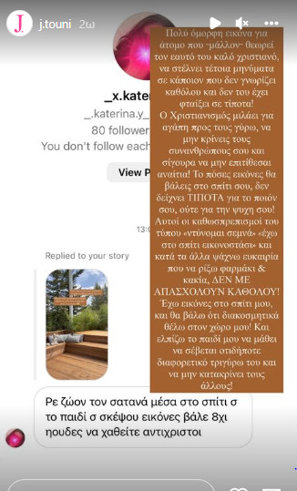 «Ρε ζώο τον σατανά μέσα στο σπίτι σου, το παιδί σου σκέψου. Εικόνες βάλε όχι Βούδες, να χαθείτε αντίχριστοι» ήταν το μήνυμα που έλαβε η Ιωάννα Τούνη.