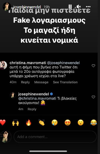 “Αυτή η φήμη που βγήκε στο Twitter ότι μετά το 20ο, αυτόγραφα, φωτογραφία υπάρχει χρέωση ισχύει στα live;“ ήταν το σχόλιο που δέχθηκε η Ζόζεφιν, με την ίδια να απαντά: “Τι βλακείες ακούγονται”.