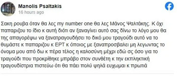Ο δημιουργός του τραγουδιού της Eurovision 2005, «My Number One», Μανώλης Ψαλτάκης, εξέφρασε τη δυσαρέσκειά του μέσω social media, καθώς δεν αναφέρθηκε το όνομά του στον πρόσφατο εθνικό τελικό της Eurovision, που έγινε την Πέμπτη 30 Ιανουαρίου.