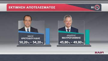 Συγκεκριμένα, ο κ. Χριστοδουλίδης καταγράφει ποσοστά από 54,2-50,2% έναντι 49,8-45,8% του Ανδρέα Μαυρογιάννη.