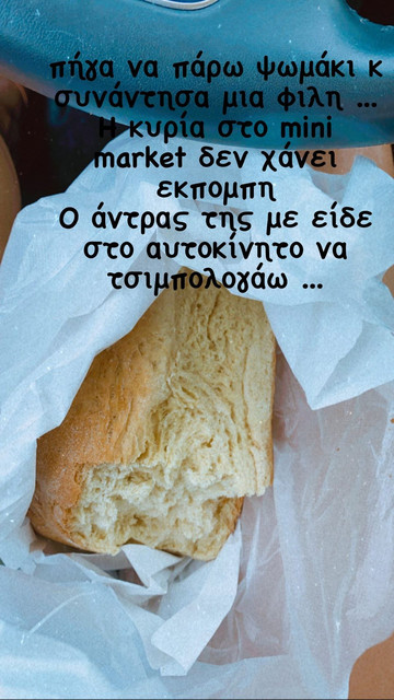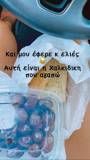 Το γεγονός την συγκίνησε τόσο πολύ που το ανέφερε μέσα από stories στον προσωπικό της λογαριασμό στο Instagram. Δείχνοντας μας το ψωμάκι και τις ελιές, η ίδια έγραψε σαν λεζάντα: