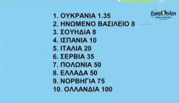 Το απόλυτο φαβορί για την πρώτη θέση παραμένει στα στοιχήματα της Eurovision 2022 η Ουκρανία ενώ την ακολουθούν το Ηνωμένο Βασιλειο στη δεύτερη θέση και η Σουηδία στην τρίτη θέση των αποδόσεων. Την υπόλοιπη δεκάδα συμπληρώνουν αυτή την ώρα η Ισπανία με ανοδική πορ, η Ιταλία, η Σερβία, η Πολωνία, η Νορβηγία και η Ολλανδία.