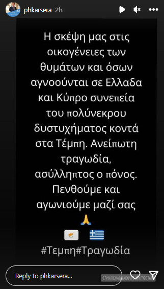 Ανάμεσα στα μηνύματα συμπαράστασης είναι κι αυτό της Πρώτης Κυρίας, Φιλίππας Καρσερά, που δημοσίευσε μια ανάρτηση στον προσωπικό της λογαριασμό στο Instagram για το τραγικό συμβάν στην Ελλάδα.