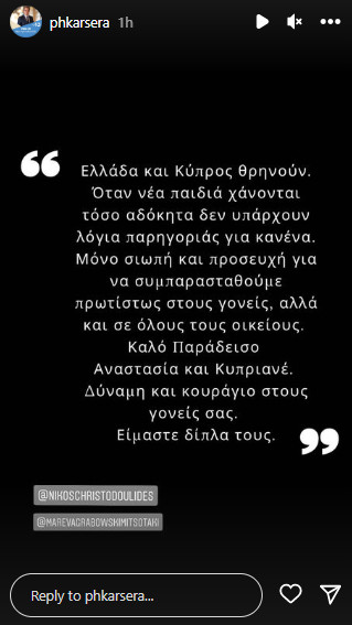 Το δικό της μήνυμα συμπαράστασης αλλά και να εκφράσει τη θλίψη της για τον αδόκητο χαμό των δύο Κυπρίων φοιτητών έστειλε και η Φιλίππα Καρσερά.