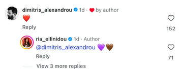 Ο Δημήτρης Αλεξάνδρου άφησε μια κόκκινη καρδιά. Η Ρία Ελληνίδου απάντησε στο σχόλιό του προσθέτοντας δύο καρδιές.