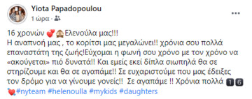 Η πρωτότοκη κόρη της Γιώτας και του Νικόλα Παπαδόπουλου, Έλενα, σήμερα γιορτάζει τα γενέθλια της και κλείνει τα 16 χρόνια ζωής.