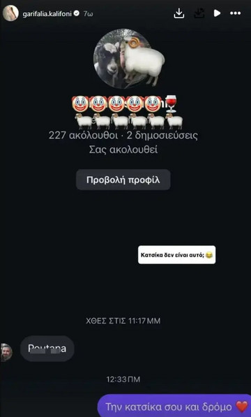 Πιο συγκεκριμένα, στην εικόνα του ακόλουθού της, φαίνεται ο ίδιος δίπλα σε μία κατσίκα. Έτσι λοιπόν, του έγραψε: «Την κατσίκα σου και δρόμο».