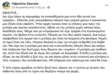 Mια συγκλονιστική ανάρτηση έκανε η Γαβριέλλα Ζάρτηλα μέσα από τον προσωπικό της λογαριασμό στο Facebook.