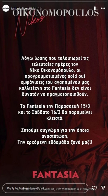 Όπως ενημέρωσε το μαγαζί με ανάρτηση στο Instagram, τις τελευταίες ημέρες μια ίωση ταλαιπωρεί τον τραγουδιστή και τον εμποδίζει να συνεχίσει ομαλά τις επαγγελματικές του υποχρεώσεις.