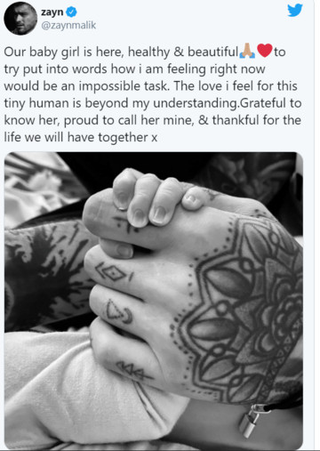 Την ίδια ώρα ο Zayn Malik στο δικό του post στο twitter έγραψε κάτω από την φωτογραφία “Η αγάπη που νιώθω γι αυτό το μικροσκοπικό πλασματάκι είναι πέραν από οτιδήποτε μπορώ να κατανοήσω”.