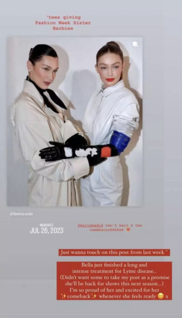 «Η Bella μόλις τελείωσε μια μακρά και έντονη θεραπεία για τη νόσο του Lyme. Δεν θα ήθελα κάποιοι να εκλάβουν την ανάρτησή μου ως υπόσχεση πως θα επιστρέψει στα σόου της επόμενης σεζόν», έγραψε αρχικά η Gigi.
