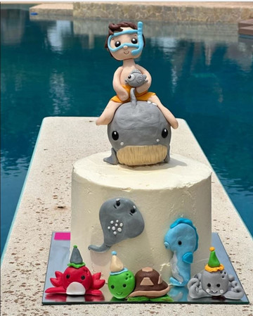 Η τούρτα ήταν εμπνευσμένη φυσικά από τη θάλασσα με φάλαινες, θαλάσσια ζωάκια και ένα μικρό αγόρι με μάσκα να την στολίζουν. Παράλληλα, ένα πλούσιο και πολύχρωμο μπουφέ είχε στηθεί για τους καλεσμένους.