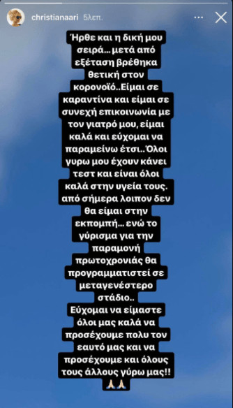 Η ίδια γνωστοποίησε το γεγονός μέσα από ανάρτηση που έκανε στον προσωπικό της λογαριασμό στο Instagram, όπου και εναπόθεσε τα πρώτα λόγια, αναφέροντας πως δεν θα μας κρατάει συντροφιά τα απογεύματα από εδώ και στο εξής… μέχρι να βγει από την καραντίνα.