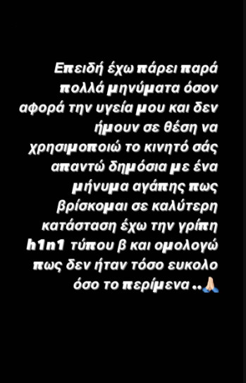 «Επειδή έχω πάρει πάρα πολλά μηνύματα όσον αφορά την υγεία μου και δεν ήμουν σε θέση να χρησιμοποιώ το κινητό, σας απαντώ δημόσια με ένα μήνυμα αγάπης πως βρίσκομαι σε καλύτερη κατάσταση.
