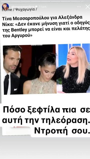 Ένα άγριο ξέσπασμα είχε ο Γιώργος Μανίκας κατά της Τίνας Μεσσαροπούλου με αφορμή όσα είπε νωρίτερα το πρωί η δημοσιογράφος για την Αλεξάνδρα Νίκα και τον οδηγό της Bentley. Το γνωστό μοντέλο δημοσίευσε μία ιστορία κι έγραψε χαρακτηριστικά: «Πόσο ξεφτίλα πια σε αυτήν την τηλεόραση. Ντροπή σου».