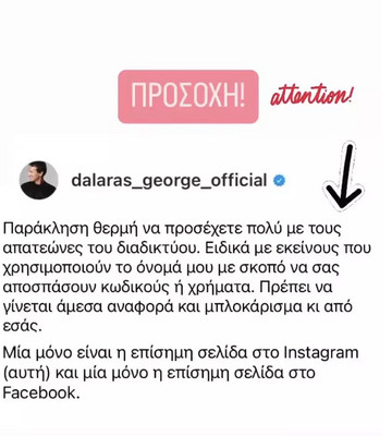 Πιο συγκεκριμένα, στην ανάρτησή του σημείωσε: «Παράκληση θέρμη να προσέχετε πολύ με τους απατεώνες του διαδικτύου. Ειδικά με εκείνους που χρησιμοποιούν το όνομά μου με σκοπό να σας αποσπάσουν κωδικούς ή χρήματα. Πρέπει να γίνεται άμεσα αναφορά και μπλοκάρισμα και από εσάς. Μία μόνο είναι η επίσημη σελίδα στο Instagram και μία μόνο η επίσημη σελίδα στο Facebook».