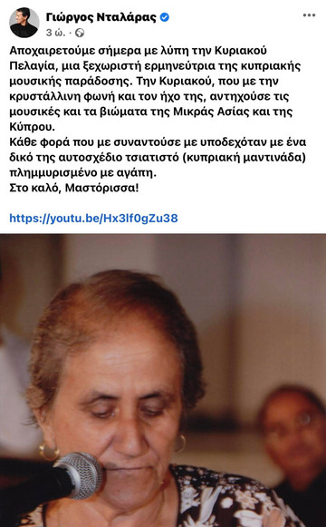 Το δικό του αντίο στην “Μαστόρισσα” του Κυπριακού Δημοτικού τραγούδιου θέλησε να πει και μέσα από τον προσωπικό του λογαριασμό στο Facebook ο Γιώργος Νταλάρας.