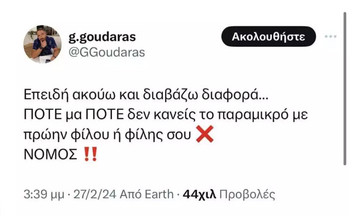 «Επειδή ακούω και διαβάζω διαφορά… ΠΟΤΕ μα ΠΟΤΕ δεν κανείς το παραμικρό με πρώην φίλου ή φίλης σου. ΝΟΜΟΣ», έγραψε ο Γρηγόρης Γκουντάρας.