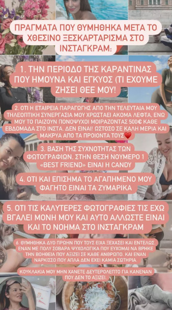 «Πράγματα που θυμήθηκα μετά το χθεσινό ξεσκαρτάρισμα στο Instagram: Η εταιρεία παραγωγής από την τελευταία μου τηλεοπτική συνεργασία μου χρωστάει ακόμη λεφτά, ενώ μου το παίζουν πονόψυχοι, μοιράζοντας 500 ευρώ κάθε βδομάδα στο Insta. Δεν είναι! Ωστόσο σε καλή μεριά και μακριά από τα προϊόντα τους!» αποκάλυψε η Νικολέττα Ράλλη.