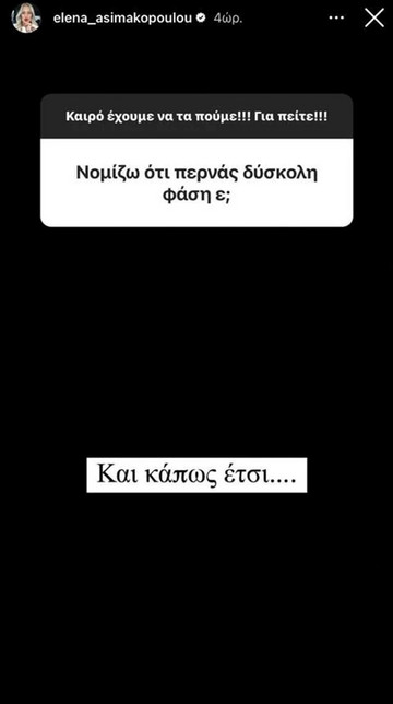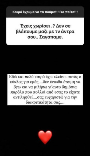 “Εδώ και πολύ καιρό έχει κλείσει αυτός ο κύκλος για εμάς… Δεν ένιωθα έτοιμη να βγω και να μιλήσω δημόσια , παρ’ όλο που πολλοί από εσάς το είχατε αντιληφθεί… Σας ευχαριστώ για τη διακριτικότητά σας” έγραψε με κάθε ειλικρίνεια η αγαπημένη ηθοποιός Έλενα Ασημακοπούλου για τον Μπρούνο Τσιρίλο.