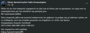 Σε ανάρτησή του μέσω Facebook, ο αδελφός του, Σάκης Αρναούτογλου, ευχαρίστησε όσους έδειξαν τη συμπαράστασή τους για την απώλεια που βιώνει και ενημέρωσε, για την επιθυμία της οικογένειάς του, σε ό,τι αφορά την κηδεία.