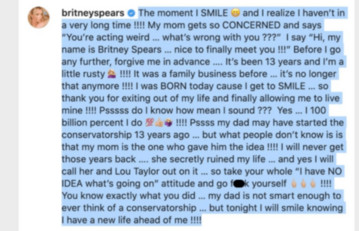 Απευθυνόμενη στη μητέρα της, Lynne Spears, η Britney Spears ολοκλήρωσε: «Ξέρεις ακριβώς τι έκανες… ο μπαμπάς μου δεν είναι αρκετά έξυπνος για να σκεφτεί ποτέ μια συντηρητική κηδεμονία».