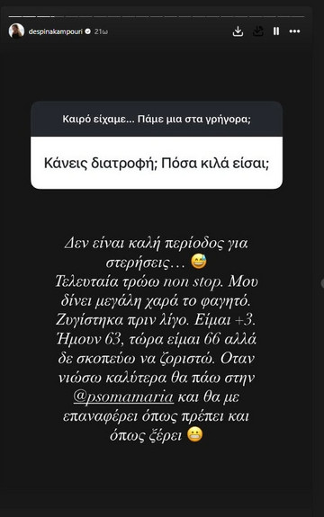 «Δεν είναι καλή περίοδος για στερήσεις… Τελευταία τρώω non stop, μου δίνει μεγάλη χαρά το φαγητό. Ζυγίστηκα πριν λίγο. Είμαι +3. Ήμουν 63, τώρα είμαι 66 αλλά δεν σκοπεύω να ζοριστώ», έγραψε χαρακτηριστικά.