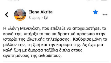«Η Ελένη Μενεγάκη, που επέλεξε να αποχαιρετήσει το κοινό της, υπήρξε το πιο επιδραστικό πρόσωπο στην ιστορία της ιδιωτικής τηλεόρασης. Καθόρισε μόνη το μέλλον της, τη ζωή και την καριέρα της. Ας έχει μια καλή ζωή με όμορφα ταξίδια δίπλα στους αγαπημένους της ανθρώπους» έγραψε χαρακτηριστικά.