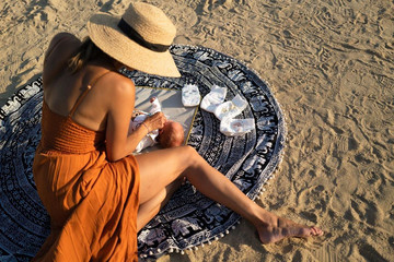 Στην εικόνα απεικονίζεται η ευτυχισμένη μαμά να ετοιμάζει το δεύτερο παιδάκι της σε μια boho στρογγυλή πετσέτα θαλάσσης.