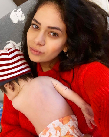 Η ίδια ποζάρει με τον μικρό Σοφοκλή στην αγκαλιά της, λίγο πριν το καθιερωμένο μπάνιο τους.