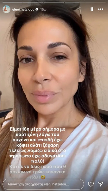 Μία πολύ προσωπική της στιγμή μοιράστηκε στα μέσα κοινωνικής δικτύωσης και συγκεκριμένα στο instagram, η Ελένη Χατζίδου. Η τραγουδίστρια και παρουσιάστρια αποκάλυψε στους followers της πως βρίσκεται στη 16η μέρα θεραπείας με κορτιζόνη, γεγονός που έχει επηρεάσει τόσο την διάθεση της όσο και την εμφάνιση της.