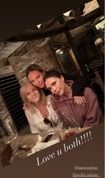 «Ιδιαίτερες οικογενειακές στιγμές. Σας αγαπώ όλους τόσο πολύ», έγραψε σε μια φωτογραφία τους όπου κάθονται όλοι γύρω από ένα μεγάλο τραπέζι. Σε μια άλλη φωτογραφία βλέ,ουμε τη Βικτόρια Μπέκαμ δίπλα στην αδερφή της Λουίζ, και τη μαμά τους Τζάκι. «Σας αγαπώ και τις δύο», έγραψε η σχεδιάστρια μόδας.