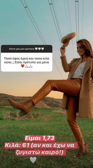 Η ίδια χωρίς να διστάζει καθόλου, απάντησε με μια φωτογραφία πώς αυτή τη χρονική περίοδο ζυγίζει 61 κιλά και έχει 1,73 ύψος.