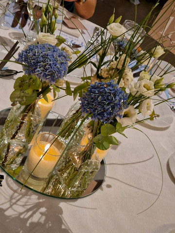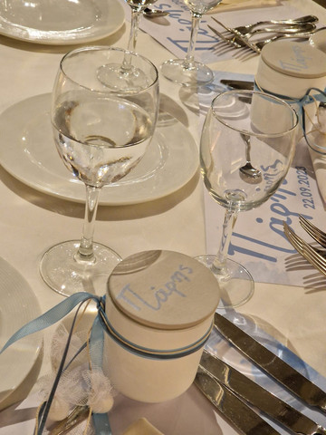 Γαλάζια και άσπρα λουλούδια βρίσκονται όμορφα διακοσμημένα στα τραπέζια των καλεσμένων, μαζί με κεριά ενώ η μπομπονιέρα αναγράφει το όνομα του νεοφώτιστου.