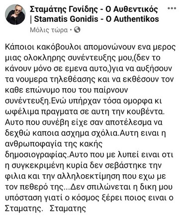 “Κάποιοι κακόβουλοι απομονώνουν ένα μέρος μιας ολόκληρης συνέντευξης μου,(δεν το κάνουν μόνο σε εμένα αυτό,) για να αυξήσουν τα νούμερα τηλεθέασης και να εκθέσουν τον κάθε επώνυμο που του παίρνουν συνέντευξη. Ενώ υπήρχαν τόσα όμορφα κι ωφέλιμα πράγματα σε αυτή την κουβέντα. Αυτό που συνέβη είχε σαν αποτέλεσμα να δεχθώ κάποια άσχημα σχόλια. Αυτή είναι η ανθρωποφαγία της κακής δημοσιογραφίας. Αυτο που με λυπεί είναι ότι η συγκεκριμένη κυρία δεν σεβάστηκε την φιλία και την αλληλοεκτίμηση που έχω με τον πεθερό της…Δεν σπιλώνεται η δική μου υπόσταση γιατί ο κόσμος ξέρει ποιος είναι ο Σταμάτης”