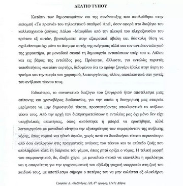 Δελτίο Τύπου, μέσω της δικηγόρου της κας Μίνας Καούνη, απέστειλε η Έλενα Μαυρίδου, μετά τη δημοσιοποίηση του διαζυγίου της από τον Δημήτρη Λάλου.