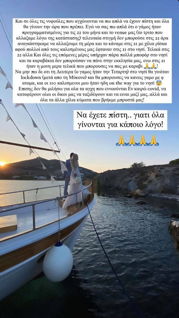 “Και σε όλες τις νυφούλες που αγχώνονται να πω απλά να έχουν πίστη και όλα θα γίνουν την ώρα που πρέπει. Εγώ να σας πω απλά ότι ο γάμος ήταν προγραμματισμένος για τις 22 του μήνα και το venue μας (το τρίτο που αλλάξαμε λόγω της κατάστασης) τελευταία στιγμή δεν μπορούσε στις 22 άρα αναγκαστήκαμε να αλλάξουμε την ημέρα και το κάναμε στις 21 με χίλια ρίσκα αφού πολλοί από τους καλεσμένους μας έφταναν στις 21 στο νησί. Τελικά στις 22 και όλες τις επόμενες ημέρες υπήρχαν πολλά μποφόρ στο νησί και τα καραβάκια δεν μπορούσαν να πάνε στην εκκλησία μας, ενώ στις 21 ήταν η μόνη ημέρα τελικά που μπορούσες να πας με καράβι. Να μην πω, δε, ότι τη Δευτέρα (ο γάμος ήταν την Τετάρτη) στο νησί θα γινόταν lockdown (μετά από τη Μύκονο) και θα μπορούσες να κάνεις γάμος με 9 άτομα, και οι 110 καλεσμένοι μου ήταν ήδη on the way για το νησί. Επίσης, δεν θα μιλήσω για όλα τα άγχη που εννοούνται εν καιρώ covid, να καταφέρουν όλοι οι δικοί μας να ταξιδέψουν και να είναι μαζί μας”
