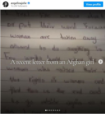 Η Angelina Jolie, η οποία είναι ενεργή όσον αφορά στα ανθρώπινα δικαιώματα, καλεί τους followers της στα μέσα κοινωνικής δικτύωσης να γνωρίσουν τις φρικαλεότητες που διαπράττονται στο Αφγανιστάν. Η 46χρονη ηθοποιός και ανθρωπιστής μοιράστηκε μια προσωπική επιστολή που έλαβε από μια νεαρή γυναίκα, σημεία της οποίας ήταν ασαφή για να μην αποκαλυφθεί η ταυτότητά της.