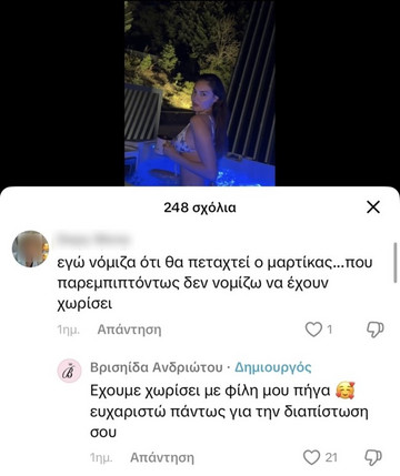Η Βρισηίδα απάντησε άμεσα, ξεκαθαρίζοντας την κατάσταση: «Έχουμε χωρίσει, με φίλη μου πήγα 🥰 ευχαριστώ πάντως για την διαπίστωση σου».