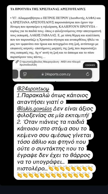 Η Χριστιάνα Αριστοτέλους απάντησε σε δημοσίευμα (το οποίο κατέβηκε λίγη ώρα μετά), απέναντι στην επίθεση που δέχθηκε επειδή κάλεσε στο στούντιο της εκπομπής “Με αγάπη Χριστιάνα” τον Λάκη Γαβαλά.