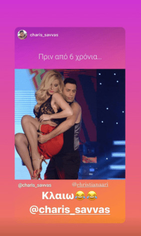 Η ίδια θέλησε να μοιραστεί την στιγμή που χόρευε τάγκο μαζί με τον χορευτή, Χάρη Σάββα, ενώ κάνουν μια αισθησιακή πόζα στον φακό. Το εν λόγω στιγμιότυπο αναδημοσίευσε ο χορευτής, κάνοντας tag την Χριστιάνα, με την ίδια να απαντά πως “κλαίει” από τα γέλια.