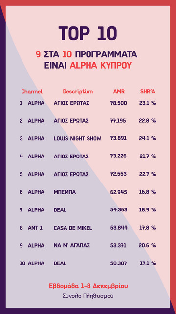 Η επιτυχία της prime time ζώνης και της μυθοπλασίας διαφαίνεται και στα κορυφαία προγράμματα της εβδομάδας. Για την προηγούμενη εβδομάδα, το top 10 της κυπριακής τηλεόρασης κατακτήθηκε από τον Alpha Κύπρου, αφού 9 στα 10 πιο επιτυχημένα προγράμματα ανήκουν στο κανάλι. Ο «Άγιος Έρωτας» συνεχίζει και καθηλώνει το κοινό με τις καταιγιστικές του εξελίξεις ενώ η σάτιρα έχει ξεκάθαρα πρόσωπο και είναι του… Λούη Πατσαλίδη με το «Λούης Night Show», ο οποίος μονοπωλεί το ενδιαφέρον.